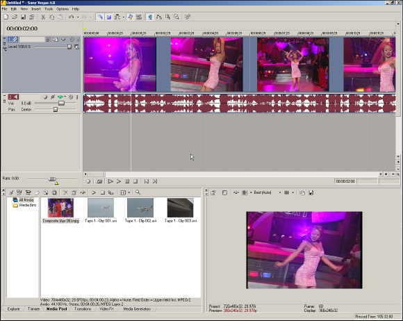 Монтаж, по своей сути, сводится к соединению видеоклипов и обрезке тех участков, которые вам не нужны. Это осуществляется с помощью переноса файлов на временную шкалу. Самый распространённый эффект заключается в переходе между клипами. В Vegas это можно делать очень просто, перехлёстывая один клип на другой.